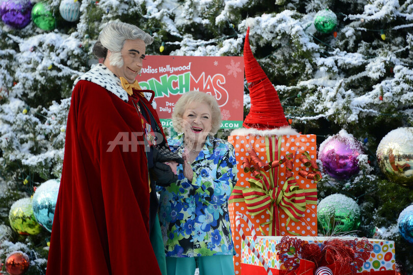 写真は「グリンチ」の登場人物にエスコートされて観客の前に登場するベティー・ホワイト(2012年12月6日撮影)。(c)AFP/Robyn BECK