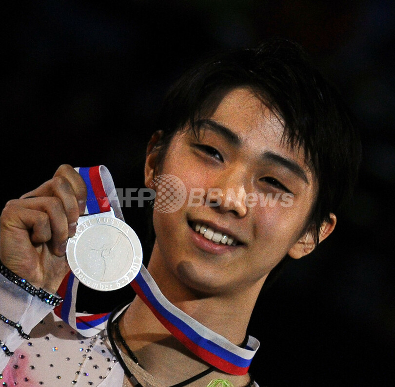 表彰式で銀メダルを手にポーズを取る羽生結弦(2012年12月8日撮影)。(c)AFP/YURI KADOBNOV