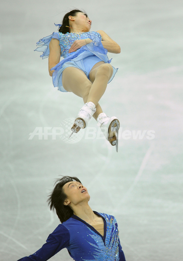 演技に臨むホウ清(Qing Pang、クィン・パン)/トウ健(Jian Tong、ジャン・トン)組(2012年12月8日撮影)。(c)AFP/ALEXANDER NEMENOV