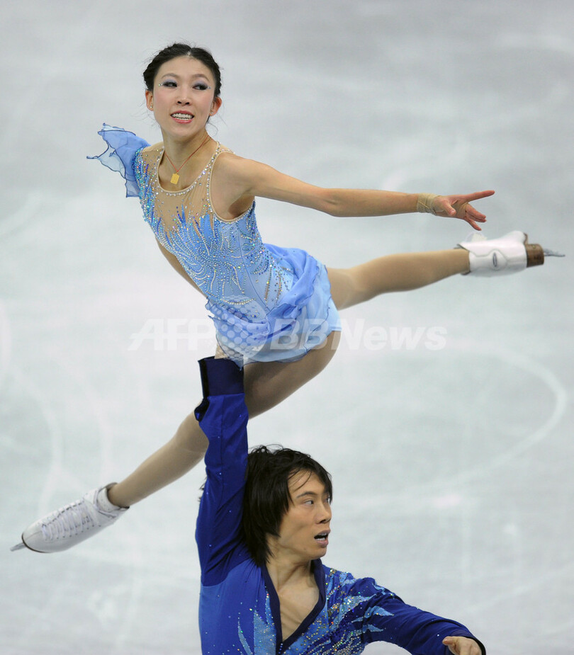 演技に臨むホウ清(Qing Pang、クィン・パン)/トウ健(Jian Tong、ジャン・トン)組(2012年12月8日撮影)。(c)AFP/ALEXANDER NEMENOV