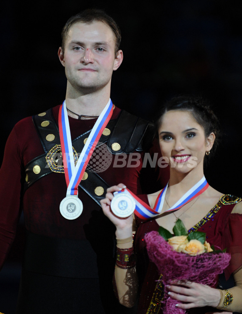 2位に入り、表彰式に臨むベラ・バザロワ(Vera Bazarova)/ユーリ・ラリオノフ(Yuri Larionov)組(2012年12月8日撮影)。(c)AFP/YURI KADOBNOV