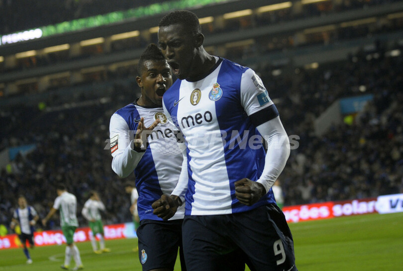 後半26分に得点を決め、チームメイトのケルビン(Kelvin Mateus de Oliveira、左)とともに歓喜するFCポルトのジャクソン・マルティネス(Jackson Martinez、2012年12月8日撮影)。(c)AFP/MIGUEL RIOPA