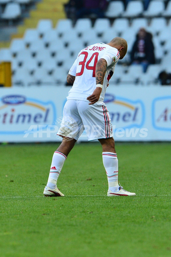 負傷し、ピッチを後にするACミランのナイジェル・デ・ヨング(Nigel de Jong、2012年12月9日撮影)。(c)AFP/GIUSEPPE CACACE