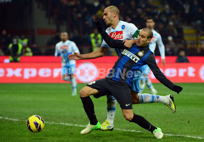 ナポリのパオロ・カンナヴァーロ(Paolo Cannavaro、奥)とボールを競るインテルのロドリゴ・パラシオ(Rodrigo Palacio、2012年12月9日撮影)。(c)AFP/OLIVIER MORIN
