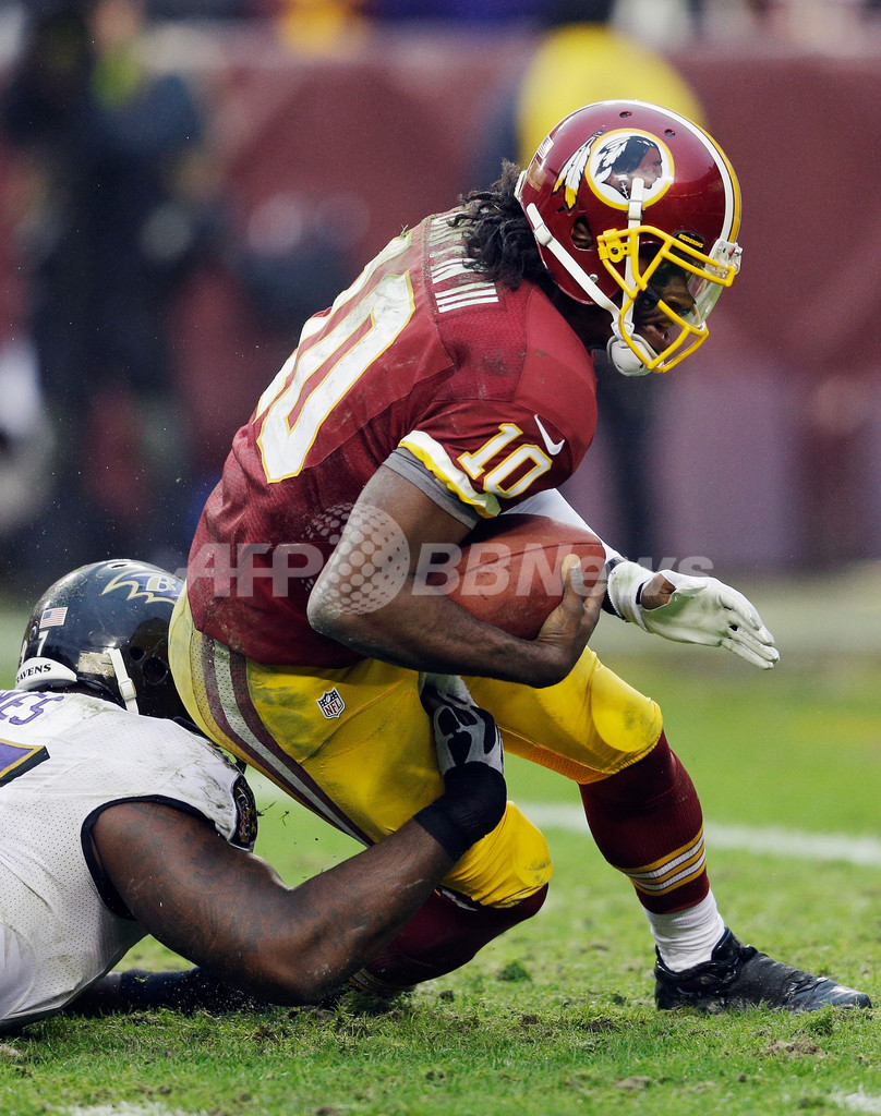 ボルティモア・レイブンズのアーサー・ジョーンズ(Arthur Jones、左下)にサックされるワシントン・レッドスキンズのロバート・グリフィン3世(Robert Griffin III、2012年12月9日撮影)。(c)AFP/Getty Images/Rob Carr