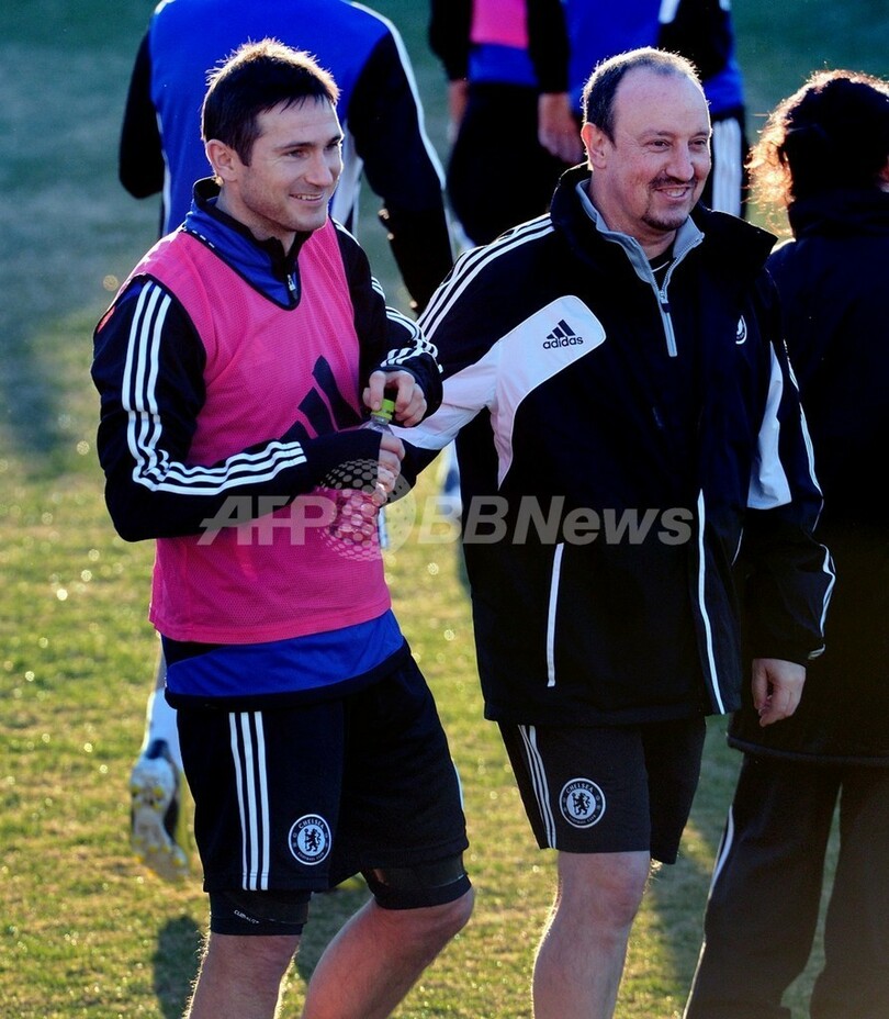 トレーニング中、ラファエル・ベニテス(Rafael Benitez)暫定監督と言葉を談笑するチェルシーのフランク・ランパード(Frank Lampard、2012年12月10日撮影)。(c)AFP/Yoshikazu TSUNO