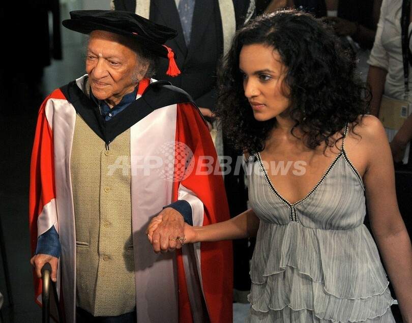 写真は、オーストラリアのメルボルン大学(University of Melbourne)から名誉学位を授与され、娘のアヌシュカー(Anoushka Shankar)さん(右)ともに授与式に出席するシャンカル氏(2010年3月19日撮影、資料写真)。(c)AFP/William WEST