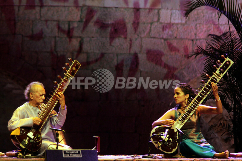 写真は、レバノンのBeiteddineで開かれた国際音楽フェスティバルで娘のアヌシュカー(Anoushka Shankar)さん(右)と演奏するシャンカル氏(2005年7月7日撮影、資料写真)。(c)AFP/JOSEPH BARRAK