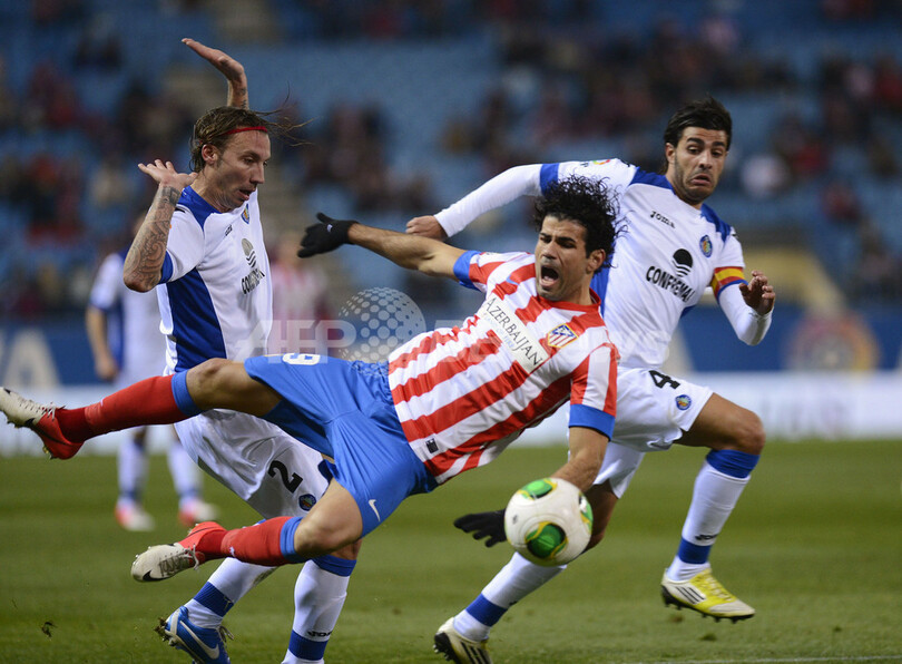 ヘタフェのアレクシス・ルアーノ・デルガド(Alexis Ruano Delgado、左)とボールを競り合いバランスを崩すアトレティコ・マドリードのジエゴ・コスタ(Diego da Silva Costa、2012年12月12日撮影)。(c)AFP/PIERRE-PHILIPPE MARCOU