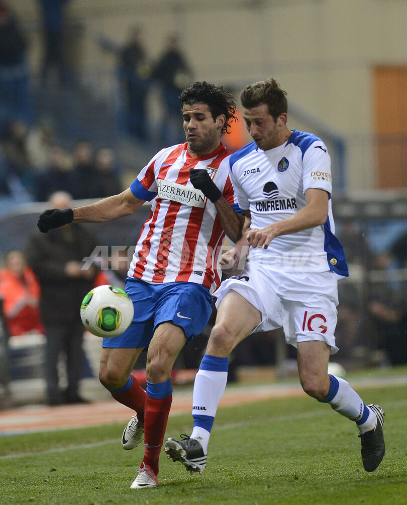 ヘタフェのダビド・アブラアム(David Angel Abraham、左)とボールを競るアトレティコ・マドリードのジエゴ・コスタ(Diego da Silva Costa、2012年12月12日撮影)。(c)AFP/PIERRE-PHILIPPE MARCOU