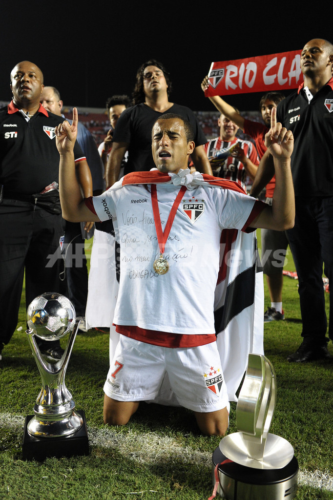 優勝に歓喜するサンパウロFCのルーカス・モウラ(Lucas Rodrigues Moura da Silva、中央、2012年12月12日撮影)。(c)AFP/Yasuyoshi CHIBA