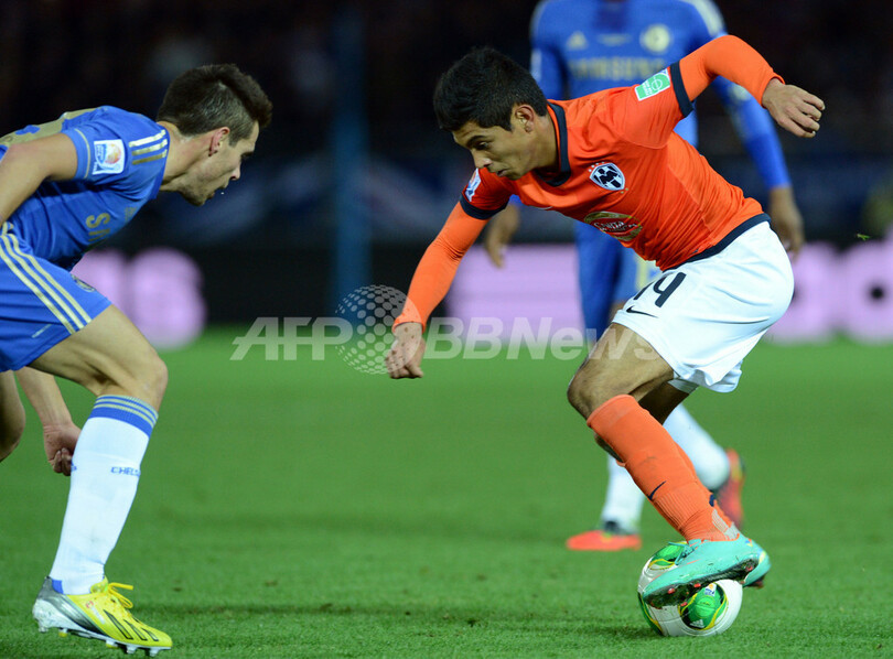 チェルシーのセサル・ アスピリクエタ(Cesar Azpilicueta、左)の前でボールをコントロールするモンテレイのヘスス・コロナ(Jesus Corona、2012年12月13日撮影)。(c)AFP/TOSHIFUMI KITAMURA