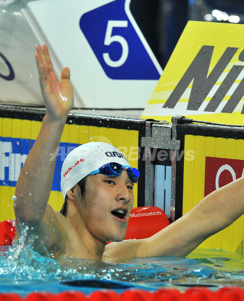 優勝を飾り、歓声に応える瀬戸大也(2012年12月13日撮影)。(c)AFP/BULENT KILIC
