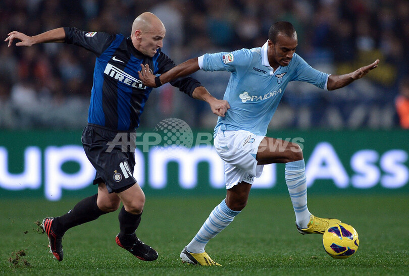 インテルのエステバン・カンビアッソ(Esteban Cambiasso、左)とボールを競るラツィオのアブドゥレイ・コンコ(Abdoulay Konko、2012年12月15日撮影)。(c)AFP/FILIPPO MONTEFORTE