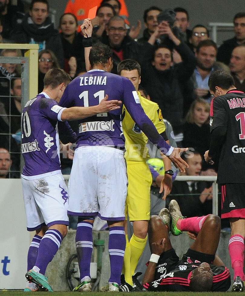 主審からレッドカードを提示されるトゥールーズのフランク・タバヌ(Franck Tabanou、左、2012年12月15日撮影)。(c)AFP/PASCAL PAVANI
