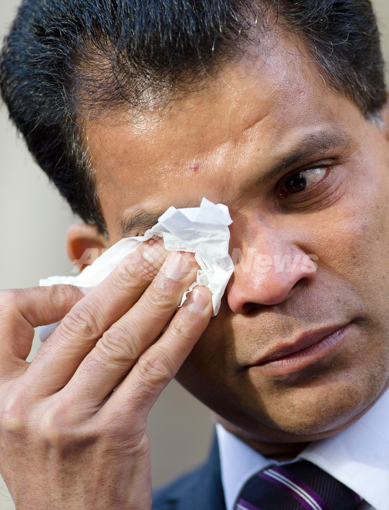 写真は大聖堂前で記者会見中に涙をぬぐう夫のバルボザさん(2012年12月15日撮影)。(c)AFP/LEON NEAL