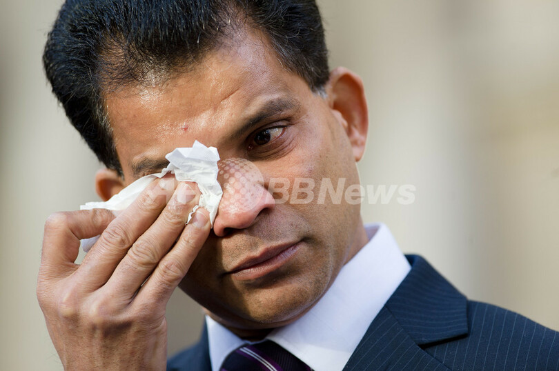 写真は大聖堂前で記者会見中に涙をぬぐう夫のバルボザさん(2012年12月15日撮影)。(c)AFP/LEON NEAL