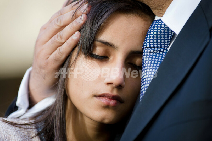 写真は大聖堂の前で家族が報道陣に声明を読み上げる中、国会議員のキース・バズ(Kieth Vaz)氏に抱きしめられるリシャさん(2012年12月15日撮影)。(c)AFP/LEON NEAL