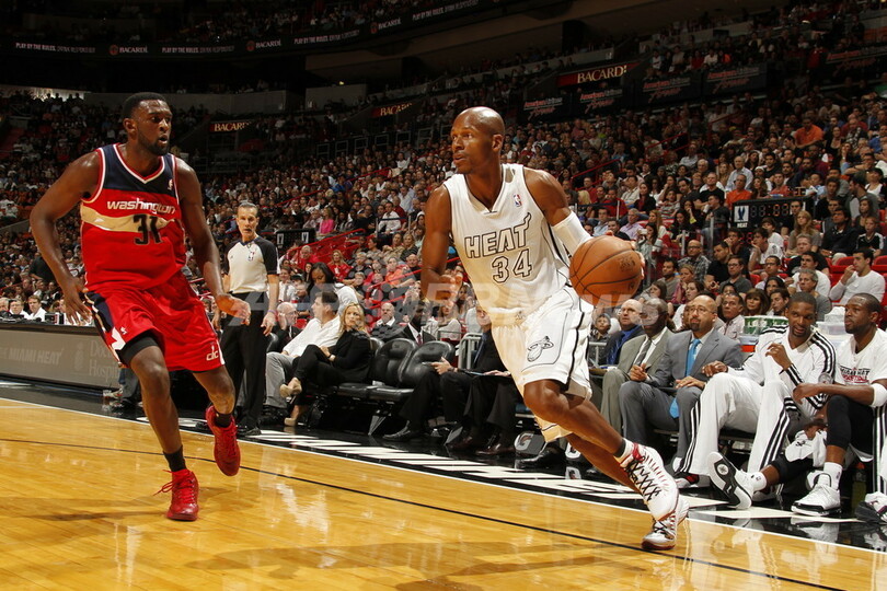 ワシントン・ウィザーズのクリス・シングルトン(Chris Singleton、左)にドライブを仕掛けるマイアミ・ヒートのレイ・アレン(Ray Allen、2012年12月15日撮影)。(c)AFP/Getty Images/NBAE/Issac Baldizon
