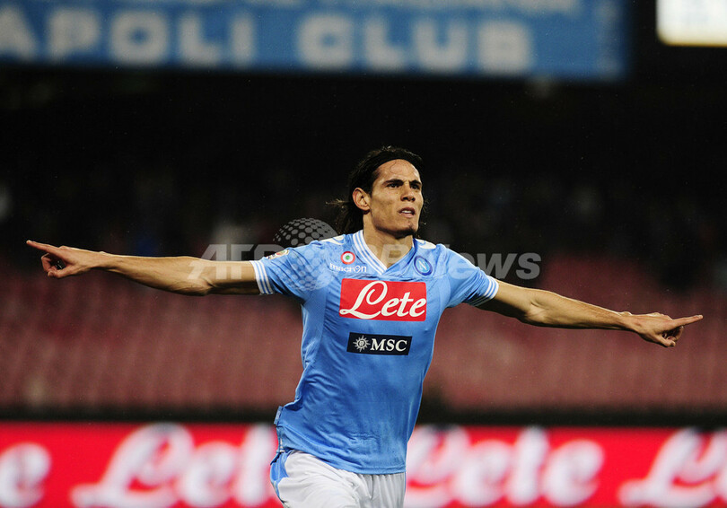 後半25分に得点を挙げ喜ぶナポリのエディンソン・カヴァーニ(Edinson Cavani、2012年12月16日撮影)。(c)AFP/ROBERTO SALOMONE