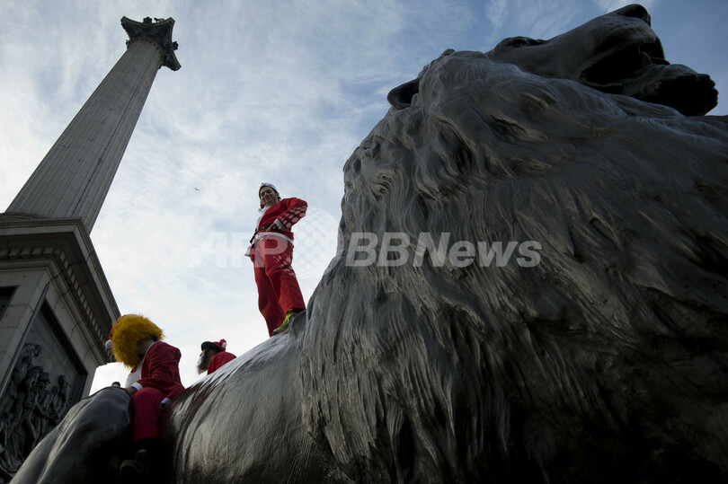 サンタクロースの仮装で集まって楽しむイベント「サンタコン(Santacon)」が15日、英ロンドン(London)中心部のトラファルガー広場(Trafalgar Square)で開催された。写真は、広場にあるライオンの像の上に立つ参加者。左後ろに見えるのはネルソン記念柱(Nelson's Column、2012年12月15日撮影)。(c)AFP/LEON NEAL