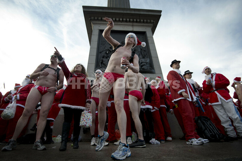 サンタクロースの仮装で集まって楽しむイベント「サンタコン(Santacon)」が15日、英ロンドン(London)中心部のトラファルガー広場(Trafalgar Square)で開催された。写真は、広場に聳え立つネルソン記念柱(Nelson's Column)の周りに集まった参加者たち(2012年12月15日撮影)。(c)AFP/LEON NEAL