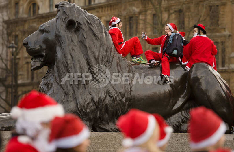 サンタクロースの仮装で集まって楽しむイベント「サンタコン(Santacon)」が15日、英ロンドン(London)中心部のトラファルガー広場(Trafalgar Square)で開催された。写真は、広場にあるライオンの像にまたがる参加者たち(2012年12月15日撮影)。(c)AFP/LEON NEAL