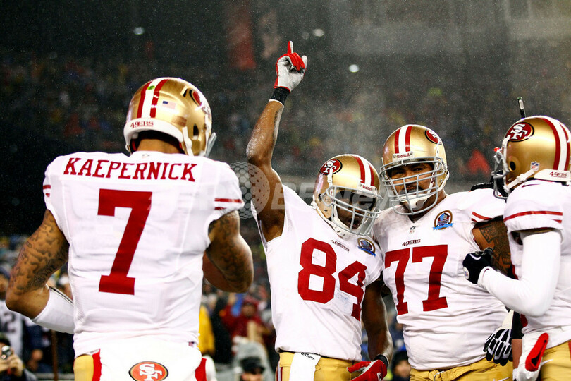 タッチダウンレシーブを決め、QBコリン・ケイパーニック(Colin Kaepernick、左)らと喜び合うサンフランシスコ・フォーティナイナーズのランディ・モス(Randy Moss、左から2人目、2012年12月16日撮影)。(c)AFP/Getty Images/Jared Wickerham