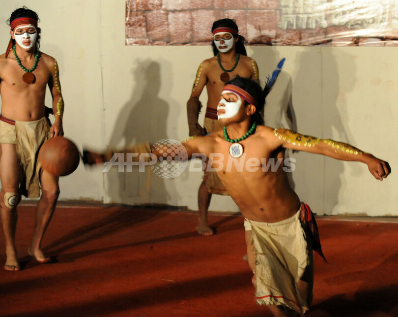 写真はホンジュラスにある古代マヤ文明のコパン(Copan)遺跡で、伝統の球技で競うホンジュラスとグアテマラのマヤ人たち。この球技は古代マヤでは儀式の一環で、敗者はいけにえとなったという(2012年12月18日撮影)。(c)AFP/Orlando SIERRA
