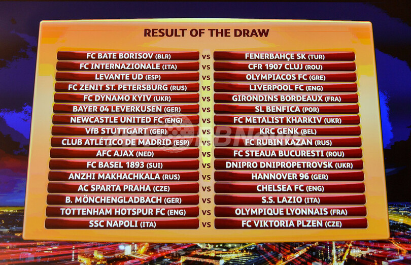 【12月21日 AFP】サッカーヨーロッパリーグ2012-13(UEFA Europa League 2012-13)決勝トーナメント1回戦の組み合わせ抽選会が20日、スイスのニヨン(Nyon)で行われた。 前回王者のアトレティコ・マドリード(Atletico de Madrid)はロシアのルビン・カザニ(Rubin Kazan)との対戦が決まった。 また、欧州チャンピオンズリーグ2012-13(UEFA Champions League 2012-13)で、前回覇者としては初めて決勝トーナメント進出を逃したチェルシー(Chelsea)はチェコのスパルタ・プラハ(Sparta Prague)と当たる。 ヨーロッパリーグ決勝トーナメント1回戦は2013年2月14日と21日に行われる。 組み合わせは以下の通り。 ・BATEボリソフ(BATE Borisov)対フェネルバフチェ(Fenerbahce) ・インテル(Inter Milan)対CFRクルージュ(CFR Cluj) ・レバンテ(Levante)対オリンピアコス(Olympiacos) ・ゼニト・サンクトペテルブルク(Zenit St. Petersburg)対リバプール(Liverpool FC) ・ディナモ・キエフ(Dynamo Kiev)対ボルドー(FC Girondins de Bordeaux) ・バイヤー・レバークーゼン(Bayer Leverkusen)対ベンフィカ(Benfica) ・ニューカッスル(Newcastle United)対メタリスト・ハルキウ(Metalist Kharkiv) ・VfBシュツットガルト(VfB Stuttgart)対KRCヘンク(KRC Genk) ・アトレティコ・マドリード対ルビン・カザニ ・アヤックス(Ajax)対ステアウア・ブカレスト(Steaua Bucharest) ・FCバーゼル(FC Basel)対FCドニエプル・ドニエプロペトロフスク(FC Dnipro Dnipropetrovsk) ・アンジ・マハチカラ(Anzhi Makhachkala)対ハノーバー96(Hannover 96) ・スパルタ・プラハ対チェルシー ・ボルシア・メンヘングラッドバッハ(Borussia Moenchengladbach)対ラツィオ(SS Lazio) ・トッテナム・ホットスパー(Tottenham Hotspur)対オリンピック・リヨン(Olympique Lyon) ・ナポリ(SSC Napoli)対ヴィクトリア・プルゼニ(Viktoria Plzen) (c)AFP