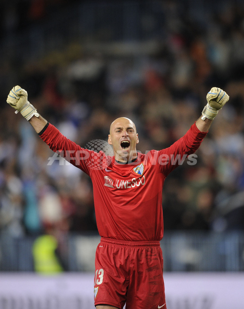 後半27分のチームの2得点目に歓喜するマラガのGKウィリー・カバジェロ(Willy Caballero、2012年12月22日撮影)。(c)AFP/PEDRO ARMESTRE
