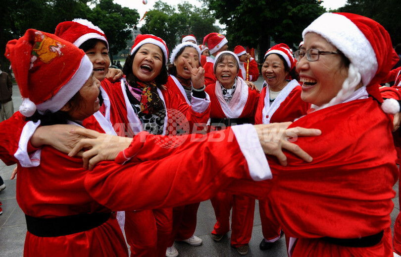 【12月23日 AFP】ベトナムの首都ハノイ(Hanoi)市内の公園に23日、地元の「笑いヨガ」クラブのメンバーがサンタクロースの衣装で集結し、声を出して笑いながらヨガの呼吸法で酸素を身体に取り込むエクササイズを行った。