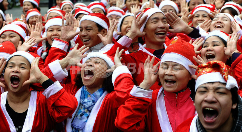【12月23日 AFP】ベトナムの首都ハノイ(Hanoi)市内の公園に23日、地元の「笑いヨガ」クラブのメンバーがサンタクロースの衣装で集結し、声を出して笑いながらヨガの呼吸法で酸素を身体に取り込むエクササイズを行った。