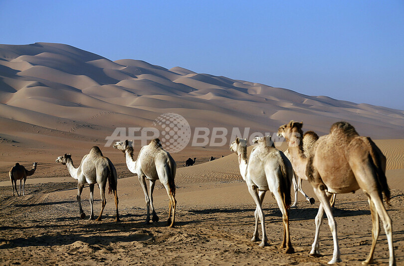 写真は、リワ砂漠(Liwa Desert)を歩くラクダ(2012年12月22日撮影)。(c)AFP/KARIM SAHIB