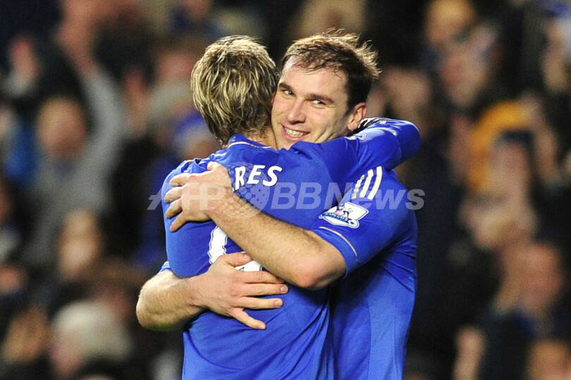前半34分にチームの3点目を挙げ、フェルナンド・トーレス(Fernando Torres、手前)と抱き合うチェルシーのブラニスラフ・イヴァノヴィッチ(Branislav Ivanovic)2012年12月23日撮影)。(c)AFP/GLYN KIRK