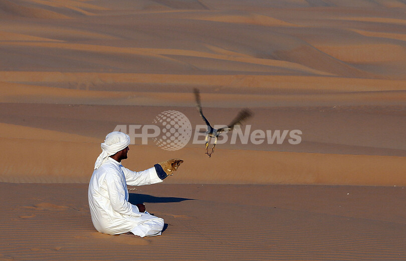 【12月24日 AFP】アラブ首長国連邦(UAE)の首都アブダビ(Abu Dhabi)の西に広がるリワ砂漠(Liwa desert)で、技を披露する鷹匠。アブダビ近郊のマディーナ・ザイード(Madinat Zayed)で開幕したラクダの祭典「Mazayin Dhafra」に合わせて催された。ラクダのレースや工芸品の展示会などが行われている「Mazayin Dhafra」には、ペルシャ湾沿岸諸国から多くの人が集まっている。(c)AFP