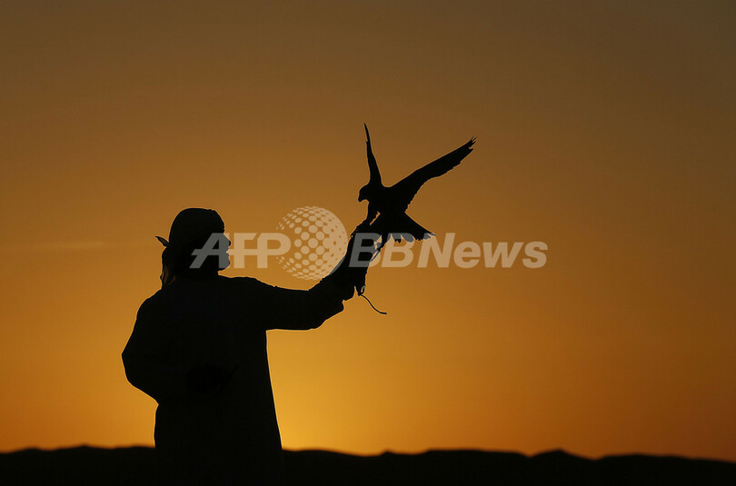 【12月24日 AFP】アラブ首長国連邦(UAE)の首都アブダビ(Abu Dhabi)の西に広がるリワ砂漠(Liwa desert)で、技を披露する鷹匠。アブダビ近郊のマディーナ・ザイード(Madinat Zayed)で開幕したラクダの祭典「Mazayin Dhafra」に合わせて催された。ラクダのレースや工芸品の展示会などが行われている「Mazayin Dhafra」には、ペルシャ湾沿岸諸国から多くの人が集まっている。(c)AFP