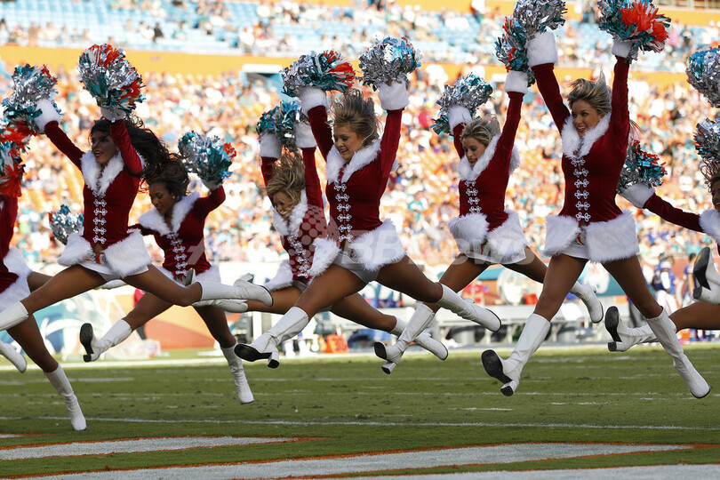 米フロリダ(Florida)州マイアミガーデンズ(Miami Gardens)のサンライフスタジアム(Sun Life Stadium)でパフォーマンスを披露するマイアミ・ドルフィンズ(Miami Dolphins)のチアリーダー(2012年12月23日撮影)。(c)AFP/Getty Images/Joel Auerbach