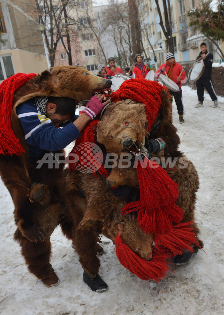 「クマの踊り」は、キリスト誕生以前からこの地方に伝来する太古の伝統舞踊で、死者の一時的な帰還を祝うもの。人々が多種多様な面をかぶりウマやヤギ、クマなど動物の動きをまねて踊る。中でもクマは、家屋や農場から悪魔を追い払い、よい1年を祝福すると信じられていた。現在でも、24日のクリスマスイブから1月6日の公現祭までの間を中心に、ルーマニアやバルカン半島諸国で広く行われているという。(c)AFP
