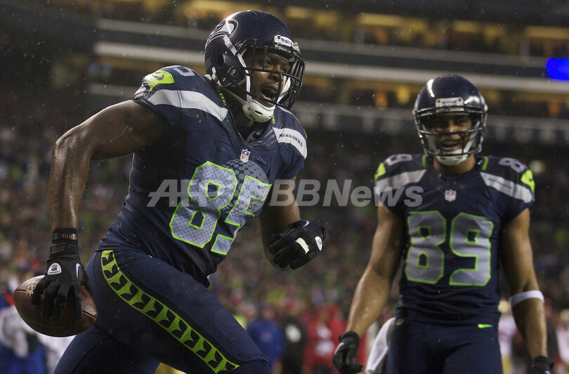 タッチダウンを奪い歓喜するシアトル・シーホークスのアンソニー・マッコイ(Anthony McCoy、2012年12月23日撮影)。(c)AFP/Getty Images/Stephen Brashear
