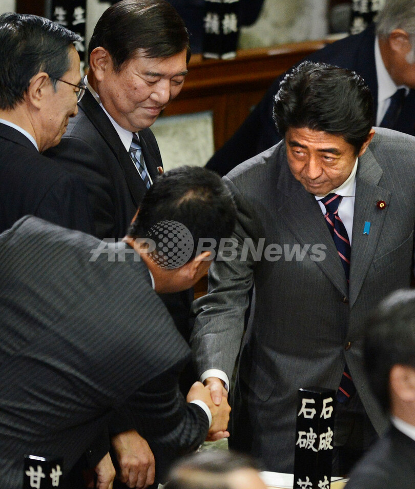 ニュース 政治・経済 第96代首相に安倍氏 2012年12月26日 16:54 発信地:東京 [ アジア・オセアニア 東京 ] このニュースをシェア ‹ › ❮ 5/8 ❯ 衆参両院は26日、首相指名投票を行い、自民党の安倍晋三(Shinzo Abe)総裁(58)を第96代首相に指名した。写真は衆議院本会議で首相指名を受け、他の議員と握手する安倍氏(右、2012年12月26日撮影)。(c)AFP/Toru YAMANAKA 画像作成中 ! 【12月26日 AFP】衆参両院は26日、首相指名投票を行い、自民党の安倍晋三(Shinzo Abe)総裁(58)を第96代首相に指名した。(c)AFP 政治・経済 一覧へ> メディア・報道関係・法人の方向け 写真・動画 購入のお問合せ>