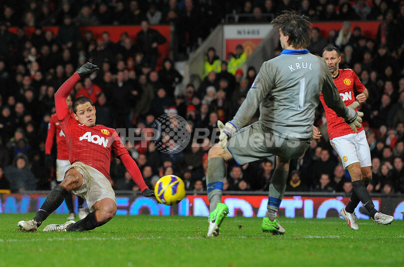 後半45分に決勝点を決めるマンチェスター・ユナイテッドのハビエル・エルナンデス(Javier Hernandez、左、2012年12月26日撮影)。(c)AFP/ANDREW YATES