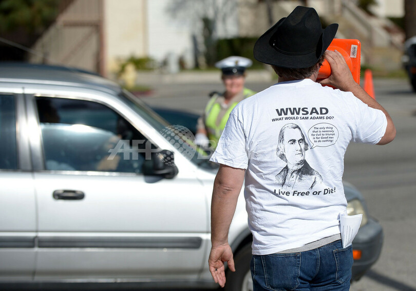 写真は、バンナイズ(Van Nuys)の会場前で抗議する銃規制反対派の男性(2012年12月26日撮影)。(c)AFP/ JOE KLAMAR