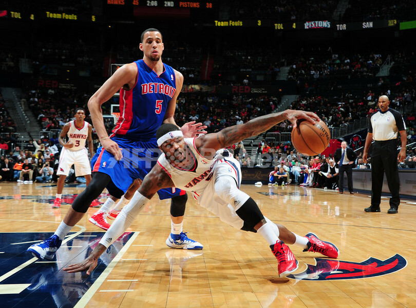 デトロイト・ピストンズのオースティン・デイ(Austin Daye、奥)の前でボールをコントロールするアトランタ・ホークスのジョシュ・スミス(Josh Smith、2012年12月26日撮影)。(c)AFP/Getty Images/NBAE/Scott Cunningham