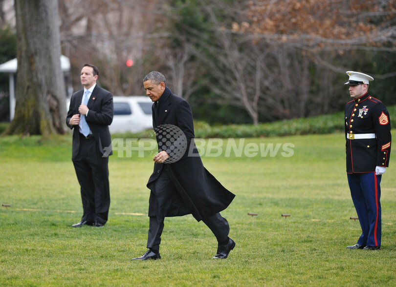 正午(日本時間28日午前2時)の少し前にホワイトハウス(White House)に到着したオバマ大統領は、集まった報道陣が叫ぶ質問には答えず足早に建物の中に入った。