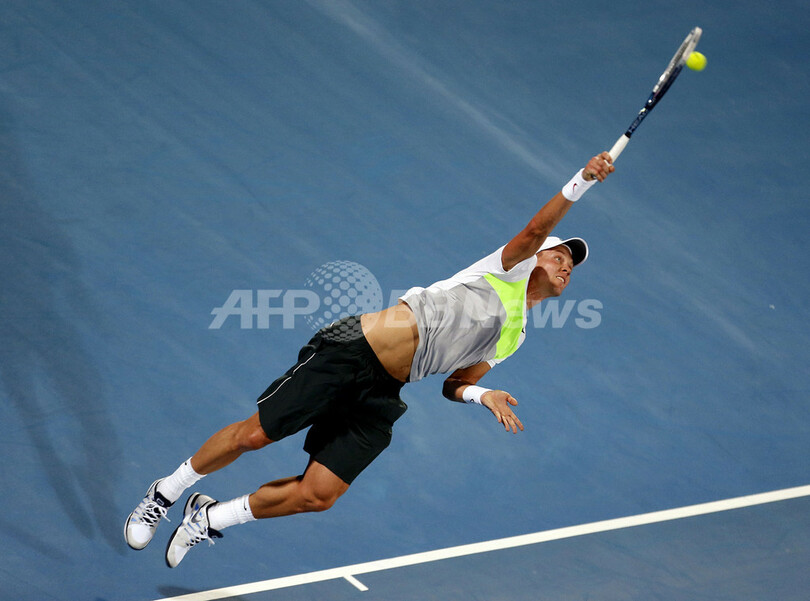 サーブを放つトマス・ベルディハ(2012年12月27日撮影)。(c)AFP/KARIM SAHIB