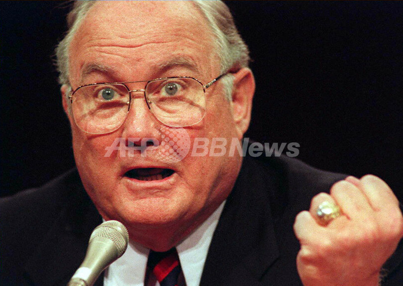 写真は、米ワシントンD.C.(Washington D.C.)の上院退役軍人委員会で、湾岸戦争時の情報隠ぺい疑惑について証言するシュワルツコフ氏(1997年1月29日撮影)。(c)AFP/Leighton MARK