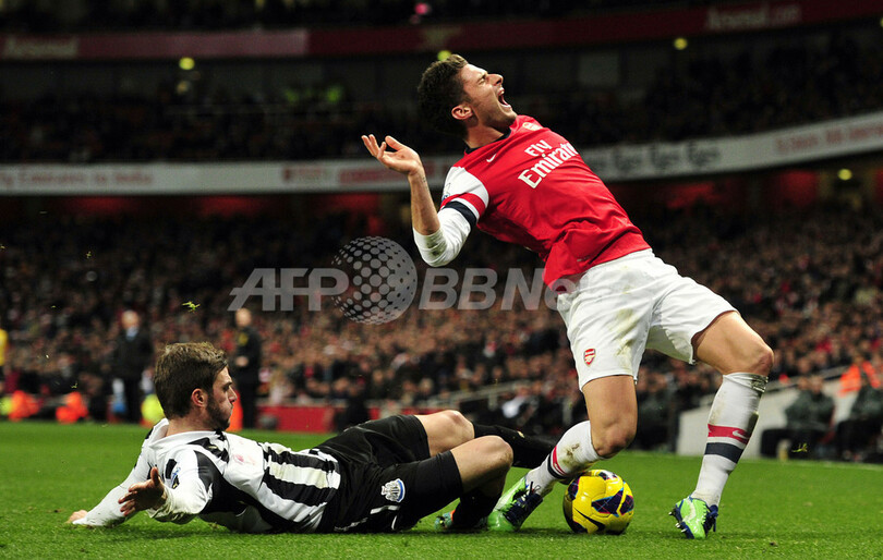 ニューカッスルのダビデ・サントン(Davide Santon、左)からファウルを受けるアーセナルのオリヴィエ・ジルー(Olivier Giroud、2012年12月29日撮影)。(c)AFP/GLYN KIRK