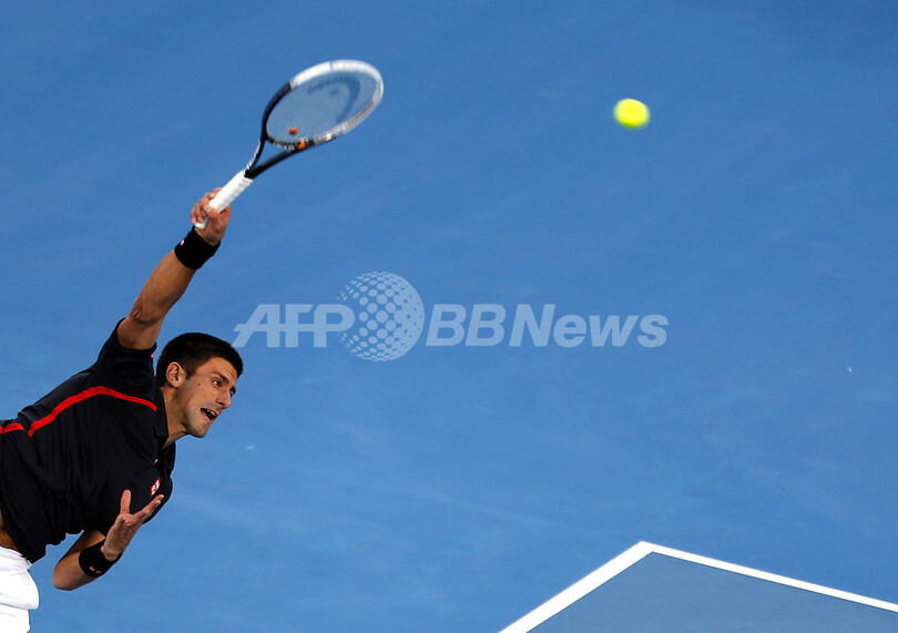サーブを放つノバク・ジョコビッチ(2012年12月29日撮影)。(c)AFP/KARIM SAHIB