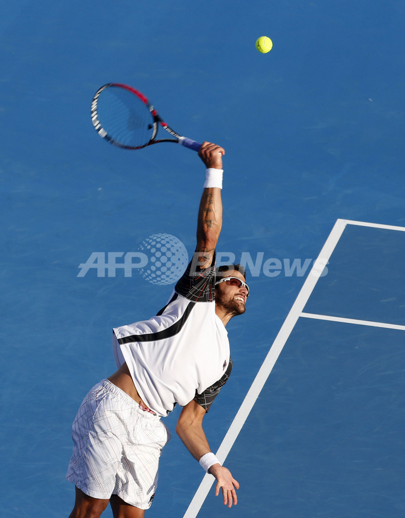 サーブを放つヤンコ・ティプサレビッチ(2012年12月29日撮影)。(c)AFP/KARIM SAHIB